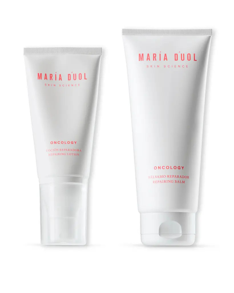 Pack de cosmética oncológica especializada para usar durante la radioterapia formado por el Bálsamo Reparador (200ml) y la Loción Reparadora (75ml) de María D'uol. Prepara tu piel con el Bálsamo antes de las sesiones y trata la piel radiada con la loción después de la radioterapia. Ideal para rojeces y quemaduras en la piel.
